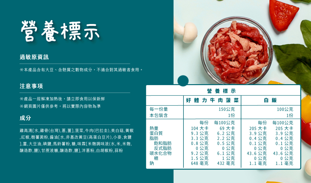 此組合含1份牛肉菠菜燴料包+1份花蓮富里白米飯